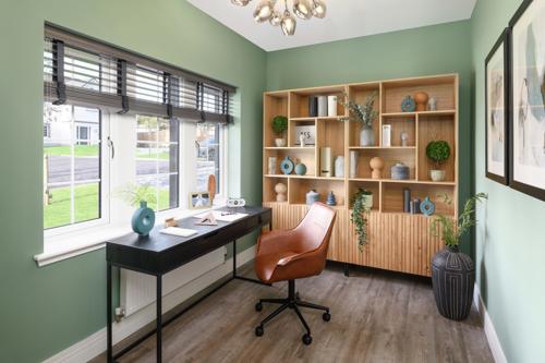 A black wooden desk and leather chair sit beneath the window, allowing its occupier to enjoy the views and the light that floods into the room. The room has a colourful “scandi” feel to it with a pop of green which was used to create a calming atmosphere.