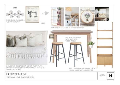 “Moving upstairs the bedrooms all have a distinctive look and feel, with the children’s rooms incorporating a palette of soft pinks, light greens and grey furnishings to create a perfect place to sleep and play. We’ve chosen to style the fifth bedroom as a bespoke ‘Hobby Room’, which still features a practical day bed for guests but also carves out space with a white work bench for crafting and hobby work – which can then all be stored away neatly.”