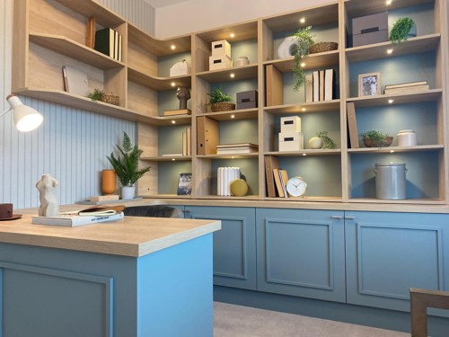 “One of my favourite features of downstairs is the study, where I’ve focused on delivering a professional office space which still has the comforts of a home with high-quality stylish seating and accessories sourced from independent craftspeople. Again, this area features natural tones on the walls and the floor to ceiling shelving we’ve installed, and is an inviting standalone space to get some work done.