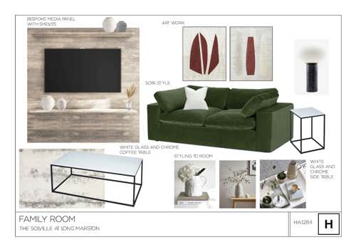 Mood boards were developed for each home and for the five-bedroom Solville, Felicity drew inspiration from the abundant green spaces and wildlife areas on site, using a colour palette of earthy green tones set again natural woods for the downstairs living area. Finishes are matte or satin throughout for a subtle, classic look and bespoke-made artwork also reflects the development’s natural surrounding environment.