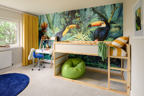 Jonathan’s winning moodboard featured a full wall tropical forest mural which has been specially printed for the showhome, green furniture and LED lights throughout, including a soft beanbag to relax in and a desk to do his homework on, with jungle-themed toys to bring the theme to life.