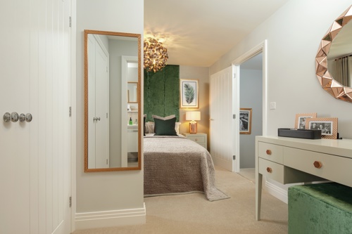 We knew that forest green was going to be the main colour used within the showhomes so that was our starting point. The metal detailing was introduced through furniture, lighting and accessories. The metals were used to create warmth and add touches of luxury to the schemes.