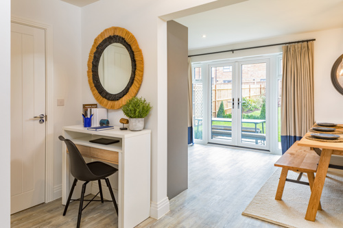 The showstopping open-plan kitchen and dining room has several functions and includes a striking sage kitchen, stylish dining area and a compact office desk.