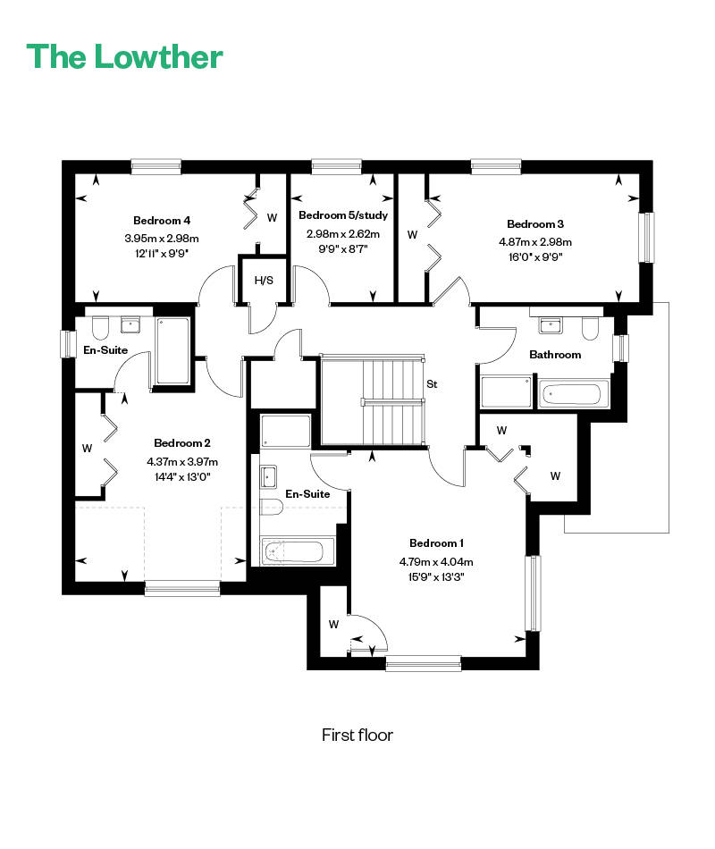 The Lowther is a characterful family home with room to grow.On the first floor, four double bedrooms and a fifth bedroom/study have access to a luxurious family bathroom. Two bedrooms feature an en suite, while the main bedroom benefits from the addition of a deeper corner wardrobe.