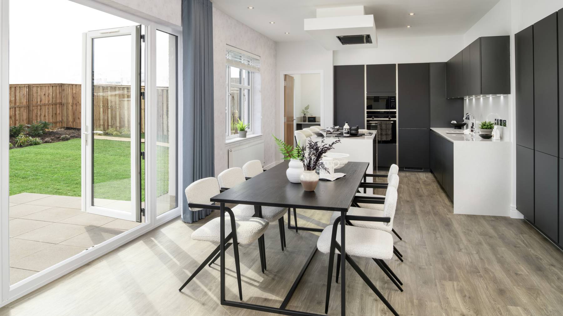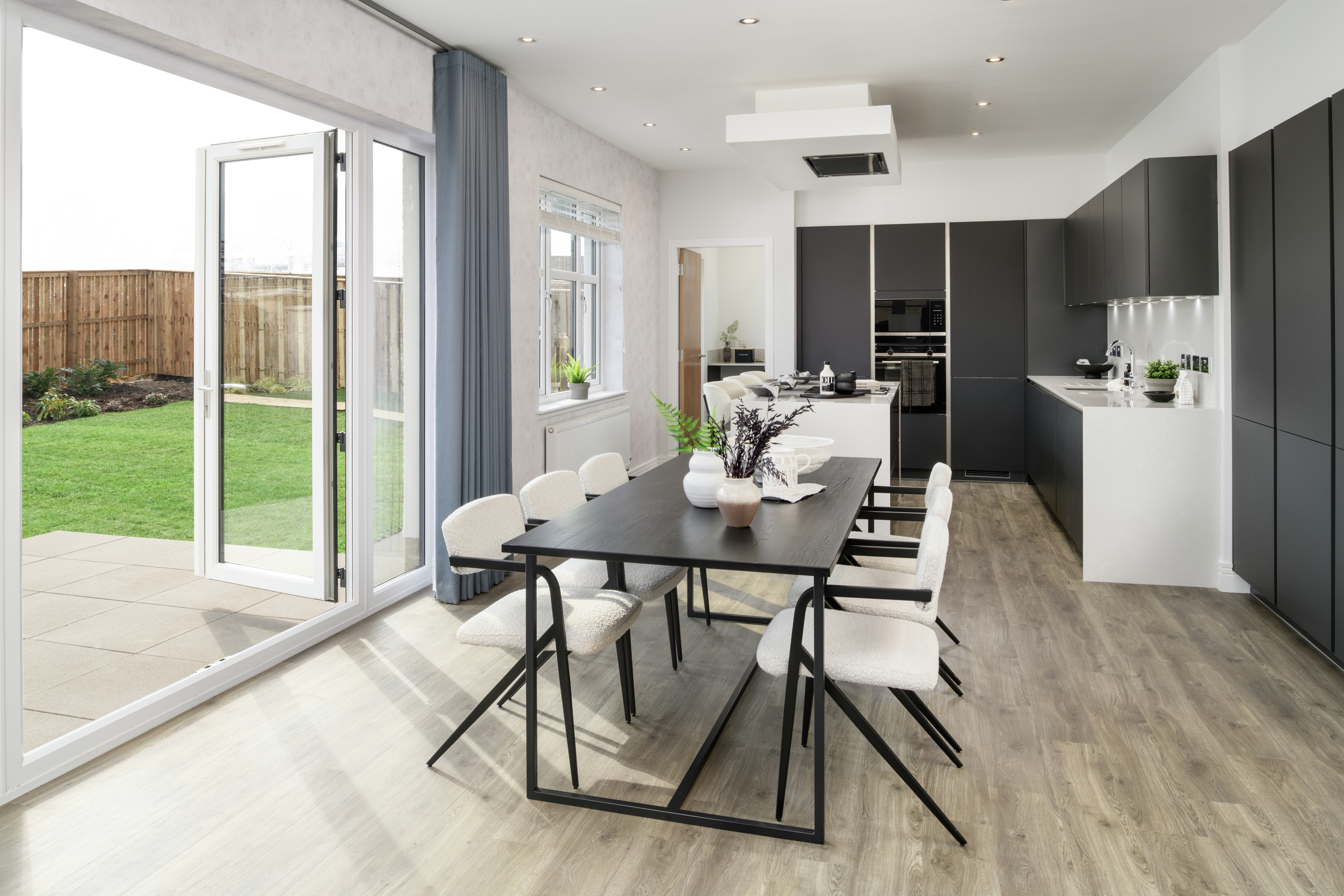 This contemporary five bedroom home has all the family space you need. Most notably, its large open plan kitchen, family and dining area with French doors, as well as a separate utility room linking the integral double garage.