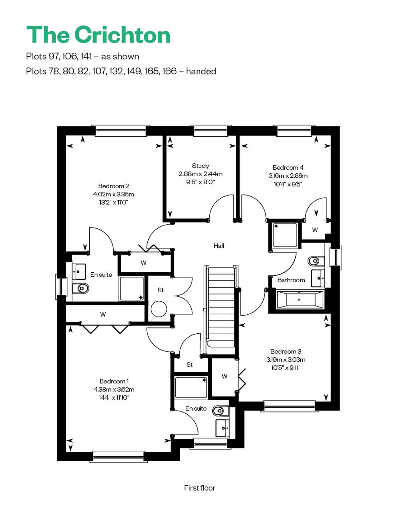 Four double bedrooms, two with en suite, plus a study/fifth bedroom make The Crichton a family home with room to grow.