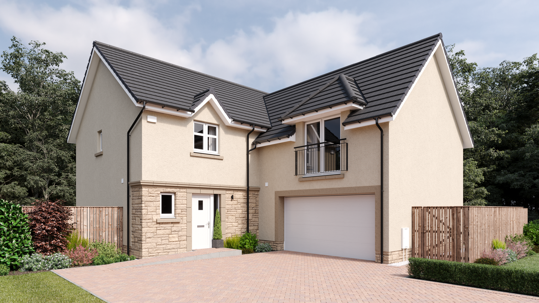 The Dewar is a spacious L-shaped, five-bedroom detached home designed for flexible family living. On the ground floor, a welcoming hallway leads to a formal lounge and an impressive open-plan kitchen, dining, and family room —both opening onto the rear garden via contemporary bi-fold/French doors. The stylish kitchen by Creative Designs features integrated Bosch appliances and peninsula island, perfect for entertaining or informal dining. A utility room, storage spaces, and a WC complete the downstairs.