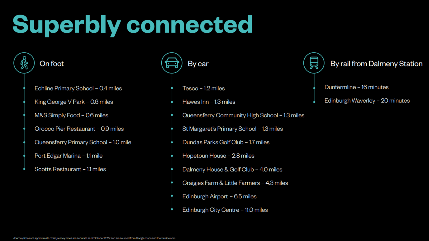 By bus: With a bus stop just meters from the southern perimeter of the site, take advantage of services throughout South Queensferry to Edinburgh including an express bus service.