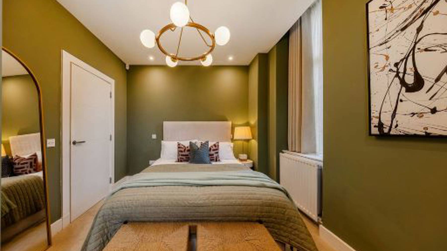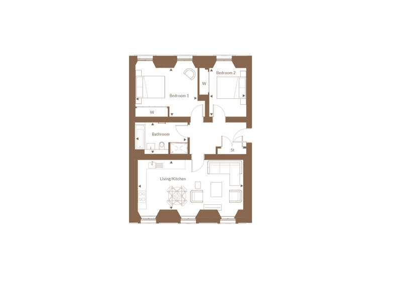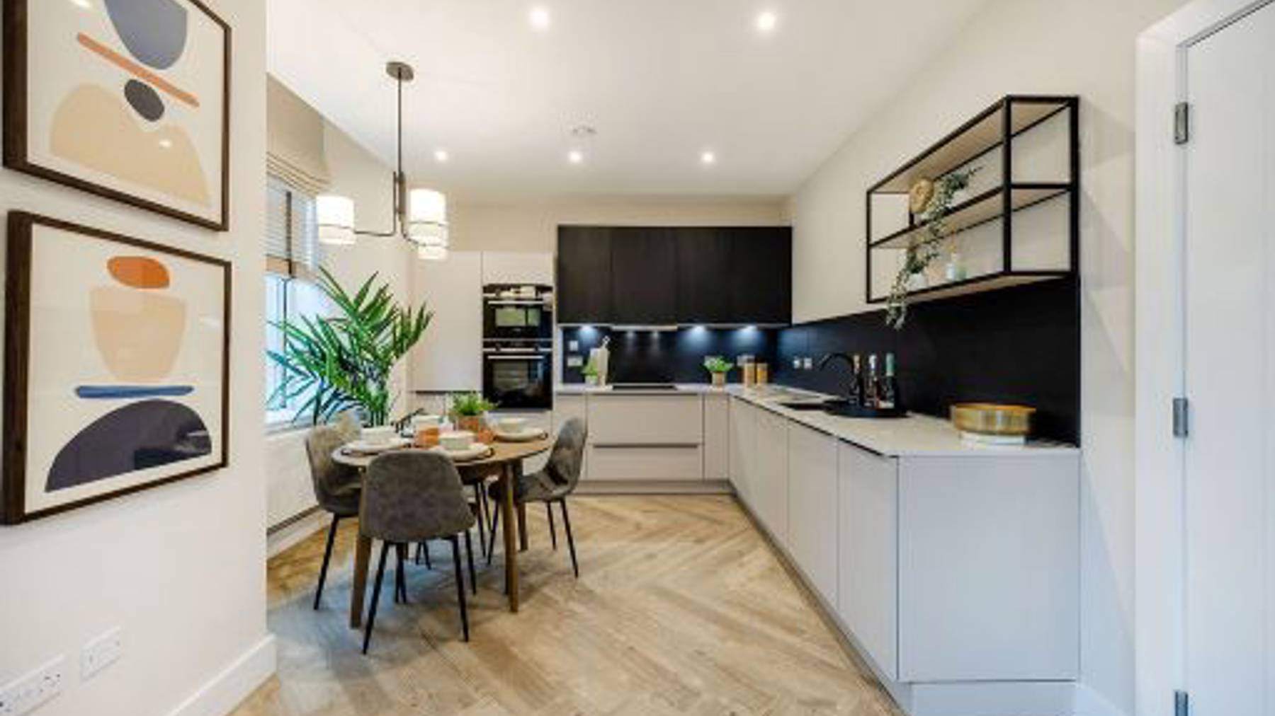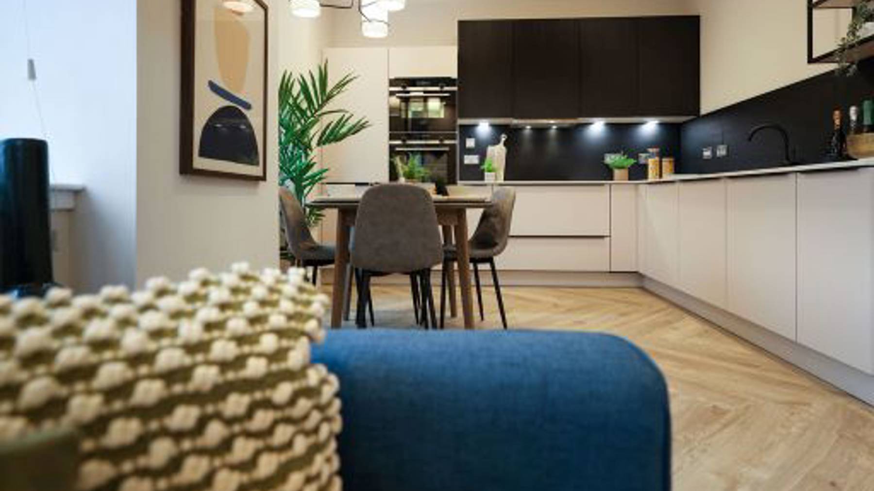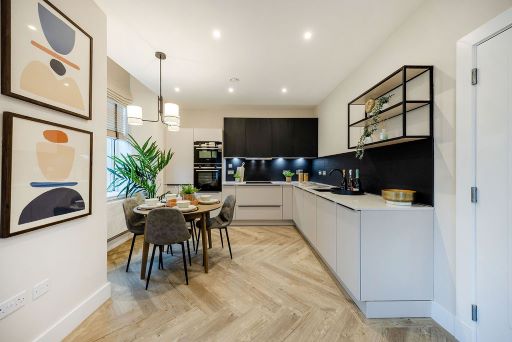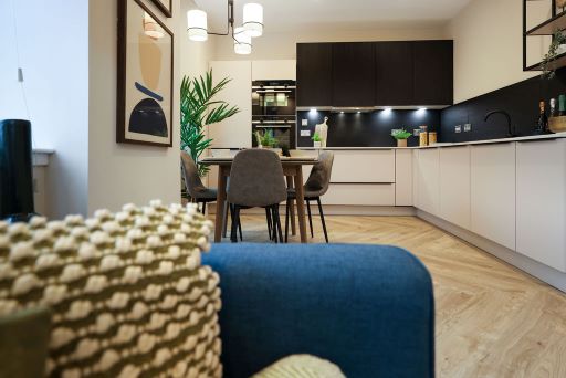 This stunning 2-bedroom apartment offers a spacious, light-filled open-plan kitchen and living area with breathtaking views across Glasgow. The L-shaped designer kitchen by Nolte features integrated Siemens appliances, creating a sleek and functional space.