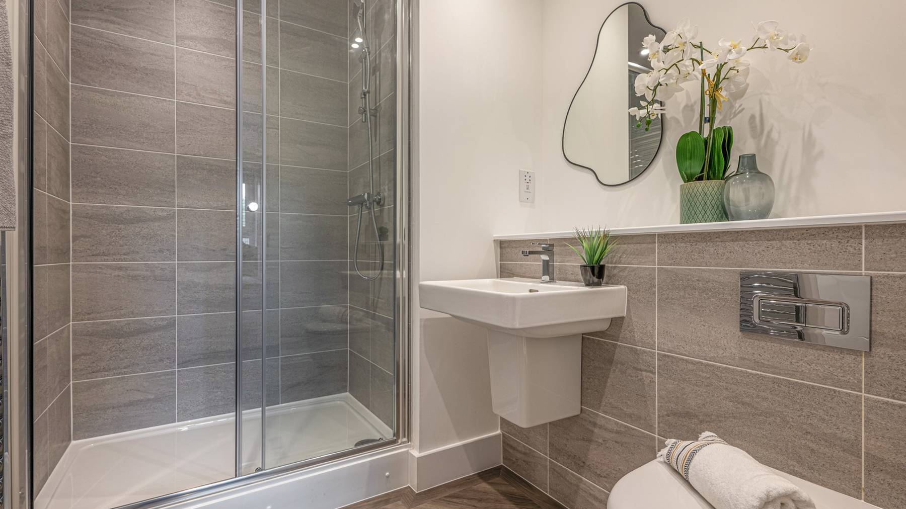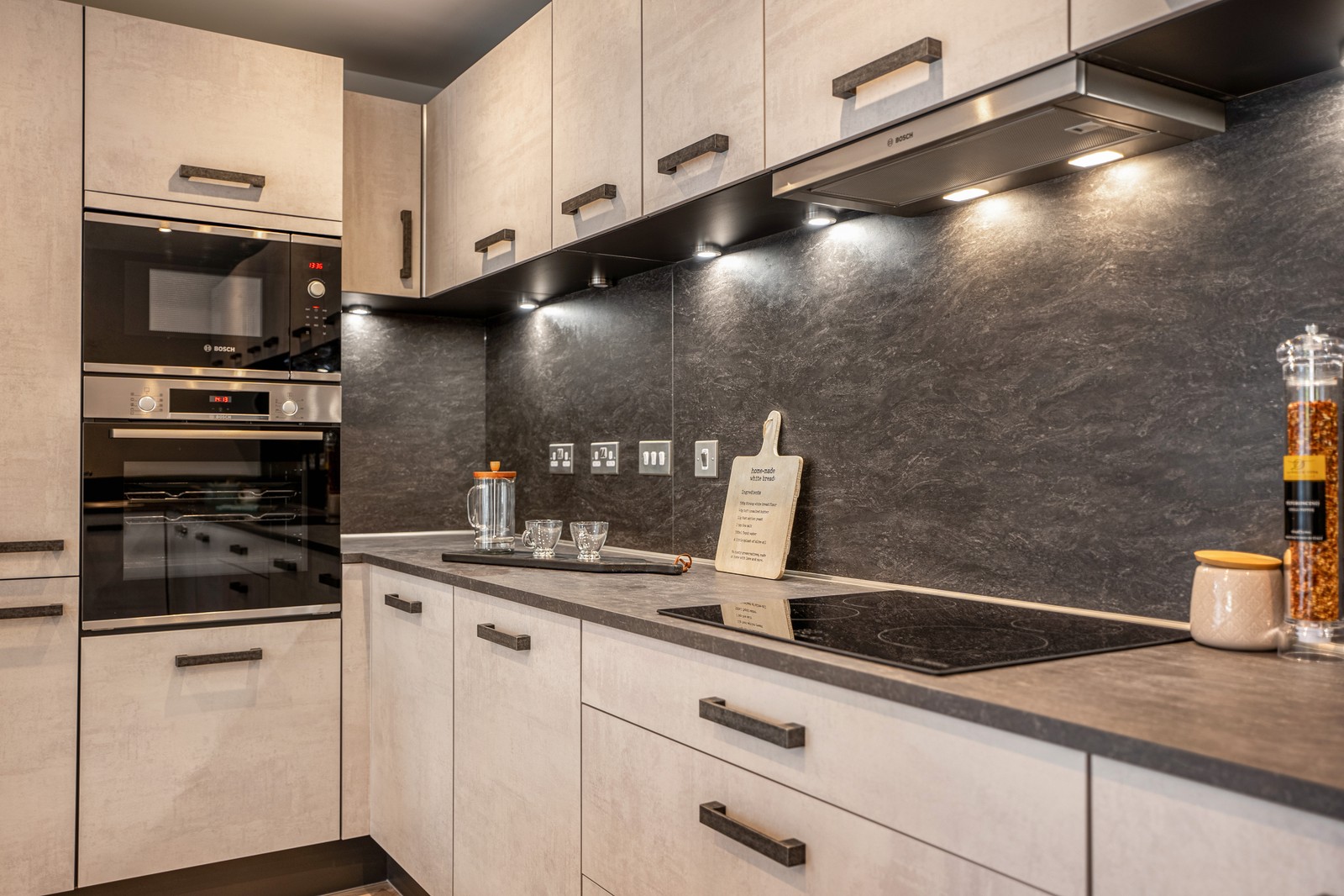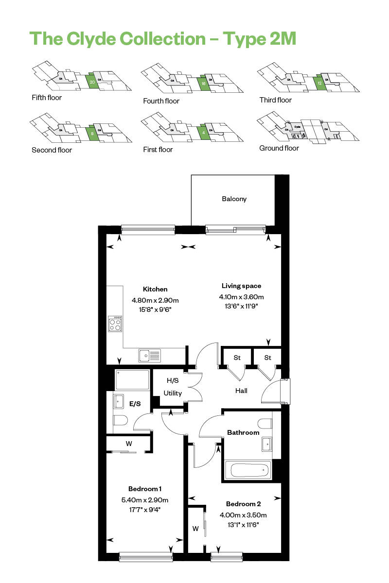 This stunning two-bedroom apartment features an impressive open-plan living space complemented by a walk-out balcony overlooking the developments’ communal gardens and green spaces. The designer kitchen by Creative Designs features integrated Bosch appliances creating a sleek and modern finish.