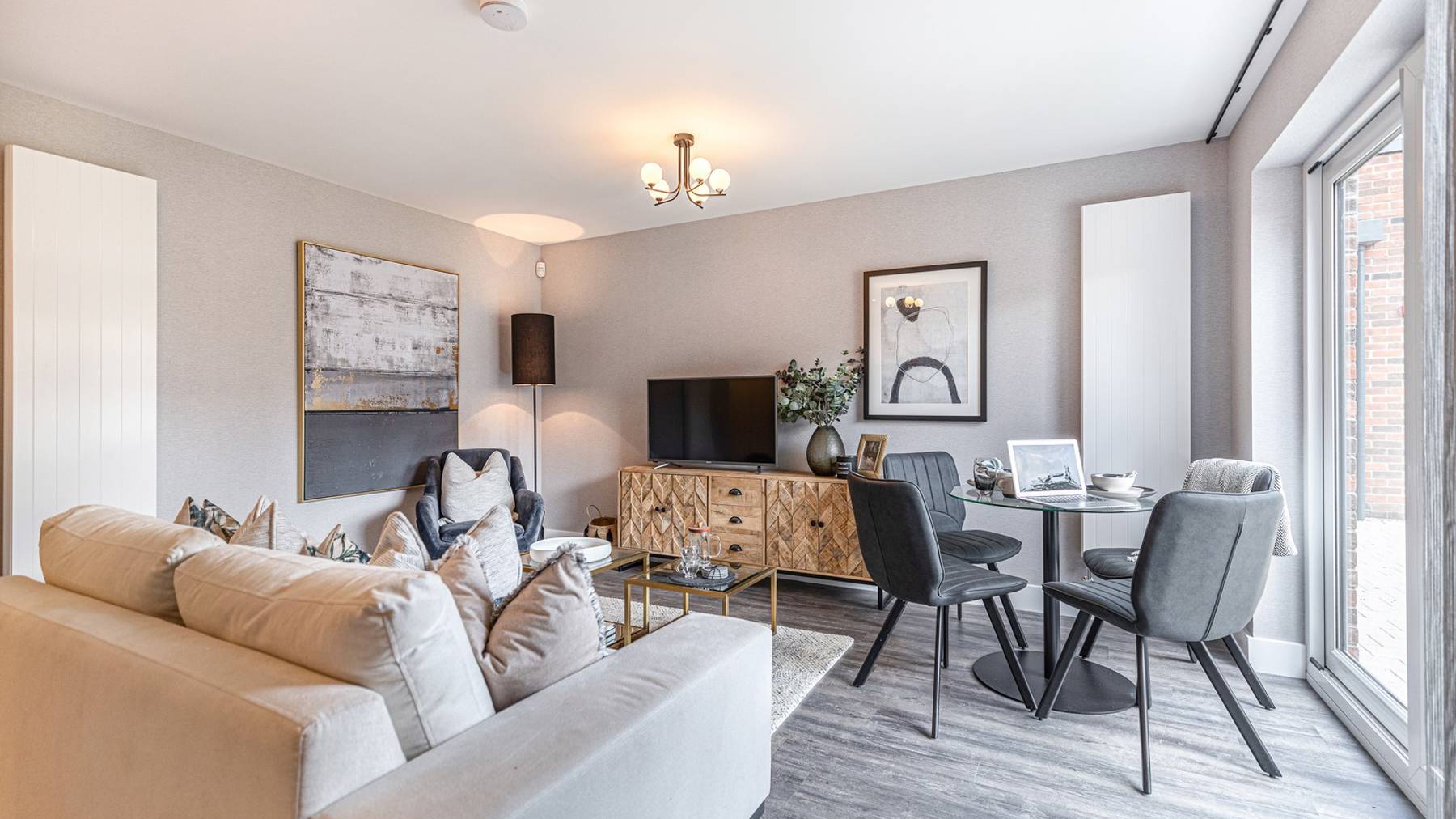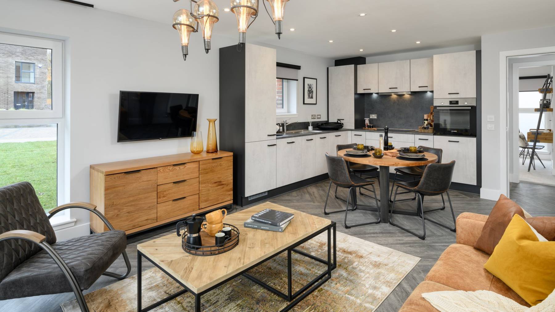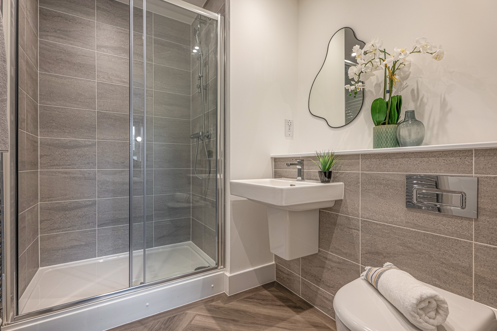 This stunning two-bedroom apartment features an impressive open-plan living space complemented by a walk-out balcony overlooking the developments’ communal gardens and green spaces. The designer kitchen by Creative Designs features integrated Bosch appliances creating a sleek and modern finish.