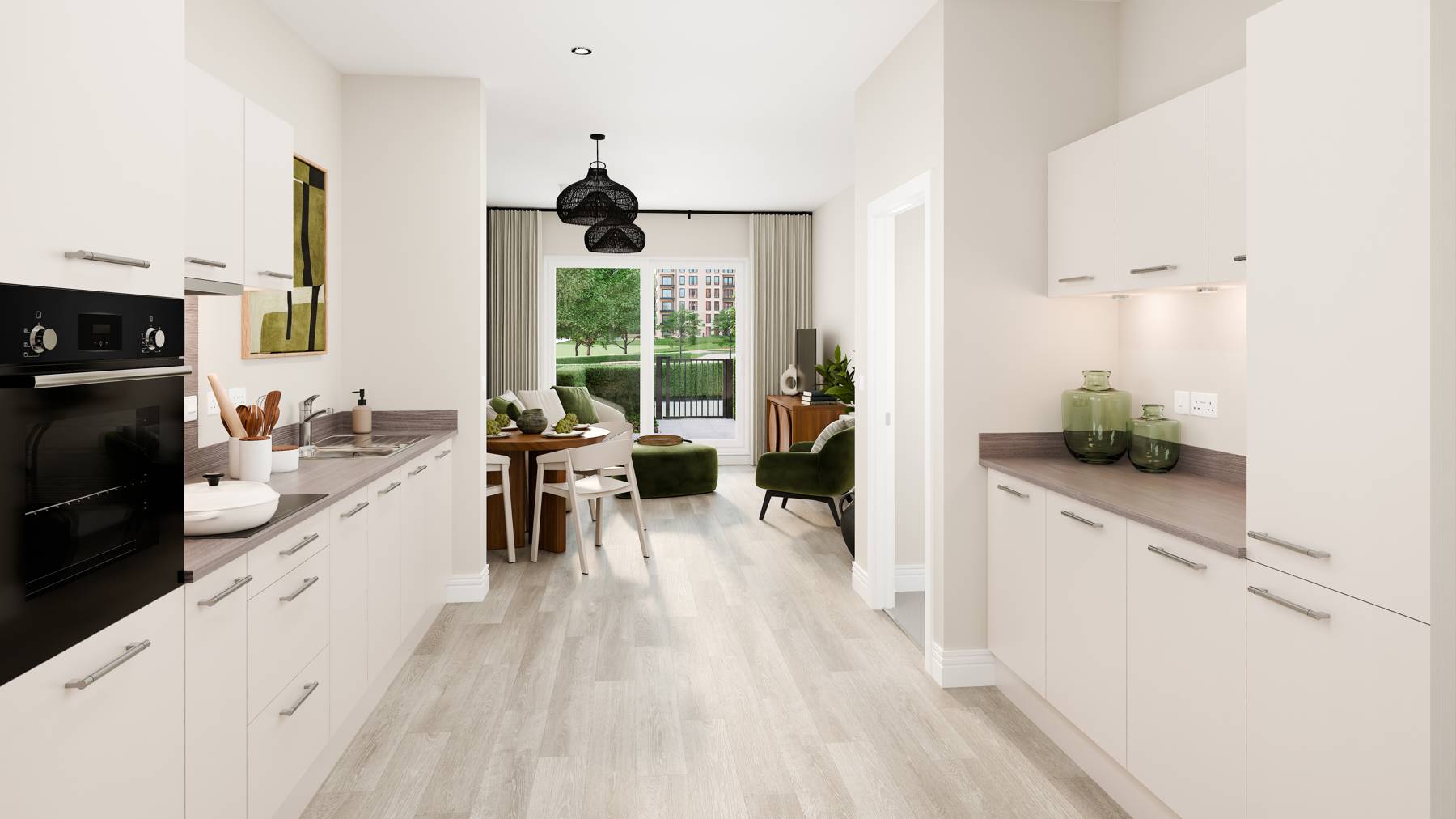 This stunning ground floor apartment features two separate private outdoor patio spaces. The open-plan kitchen and living space is elongated, offering the perfect place for entertaining friends and family. The kitchen by Creative Designs offers ample countertop space and integrated Bosch appliances.
