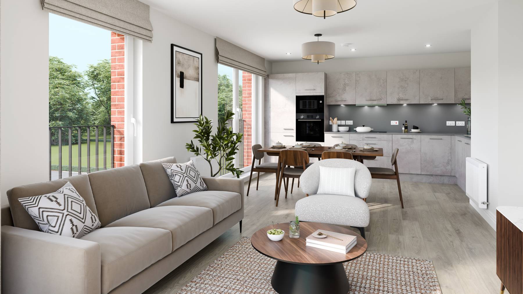 The dual-aspect open plan living area features a designer kitchen with integrated Bosch appliances and full-height sliding patio doors leading to a private balcony. It truly is a fantastic space for relaxing or entertaining.
