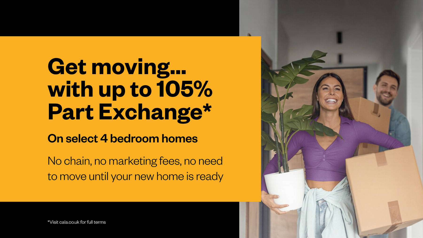 *Cala will obtain 2 independent valuations based on achieving a sale in a 4-6 week period. Part Exchange considered subject to our purchasing criteria. Up to 105% market value will be offered on select homes at Craighall Village, Millerhill for legal completion by 31st August 2026. Part Exchange available on selected plots and not in conjunction with any other offer unless agreed by us at time of reservation. Full terms and conditions and purchasing criteria can be found on our website.