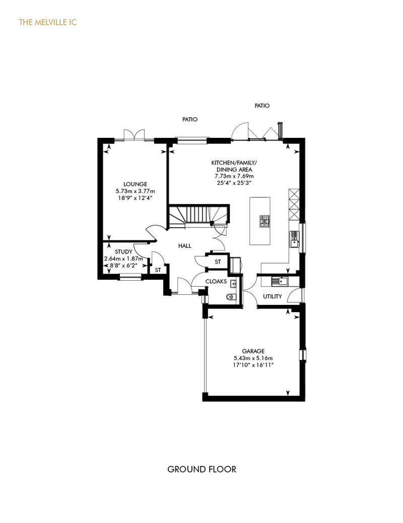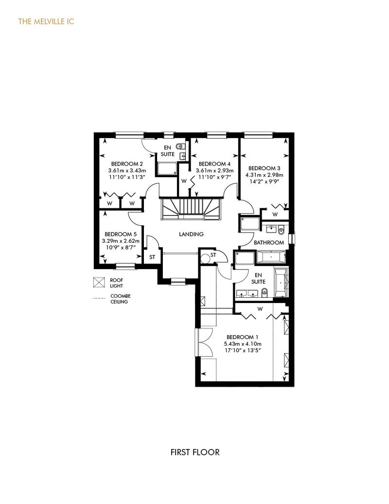 The charming L-shaped Melville enjoys an interlinked ground floor, with the exceptionally spacious lounge, including separate study, flowing into a sizeable kitchen area with dining and family space overlooking the rear garden. Upstairs the spacious landing takes you to five spacious bedrooms, two of which are en suite, and the family bathroom. Four bedrooms feature fitted wardrobes.