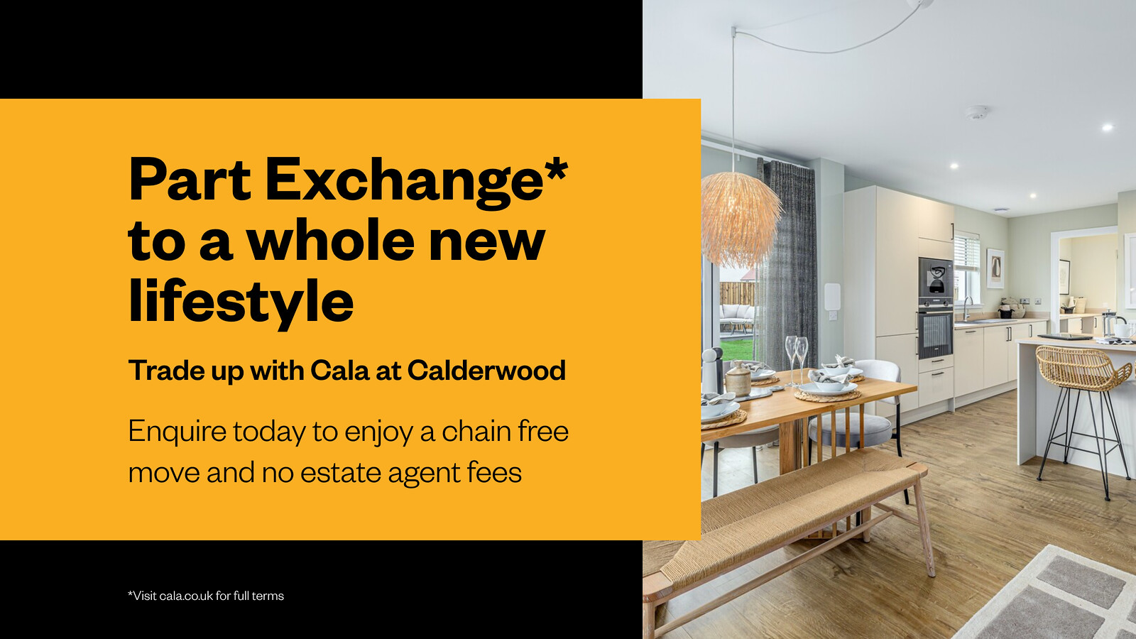 There are so many reasons to move into a Cala home at Calderwood. To help make it happen, we have three great moving solutions that you can select from: Part Exchange, Mortgage Pay or LBTT contribution*. Cala. Let’s talk. *On select homes. For reservation by 23rd March 2026.