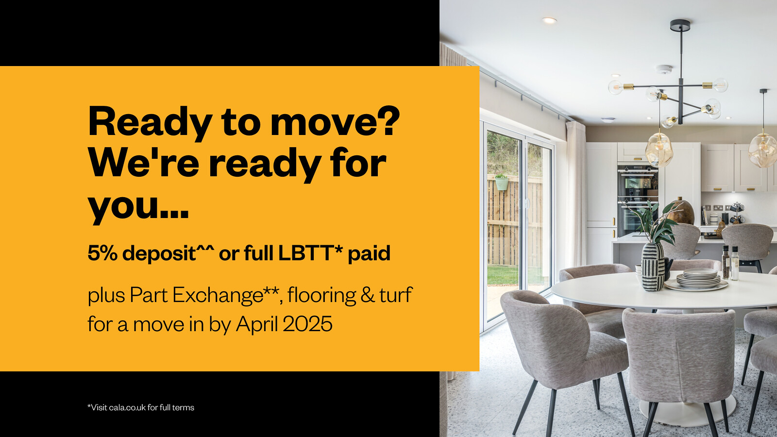 Photography may have been enhanced in post-production and may include upgrades at additional cost. Computer Generated Images may show features fittings, décor, flooring and soft furnishings which are not fitted as standard in a Cala home. CGIs are used to suggest possible finishes that can be achieved in your home at an additional cost. Please consult a Cala representative for further details. Predictive Energy Assessment and Energy Performance Certificate calculations in Scotland are changing. The specification and efficiency of our homes is not changing, but the EPC rating may, which could affect lending eligibility, particularly green mortgages. Visit www.cala.co.uk/epcscotland for more information or speak to a Cala sales representative.