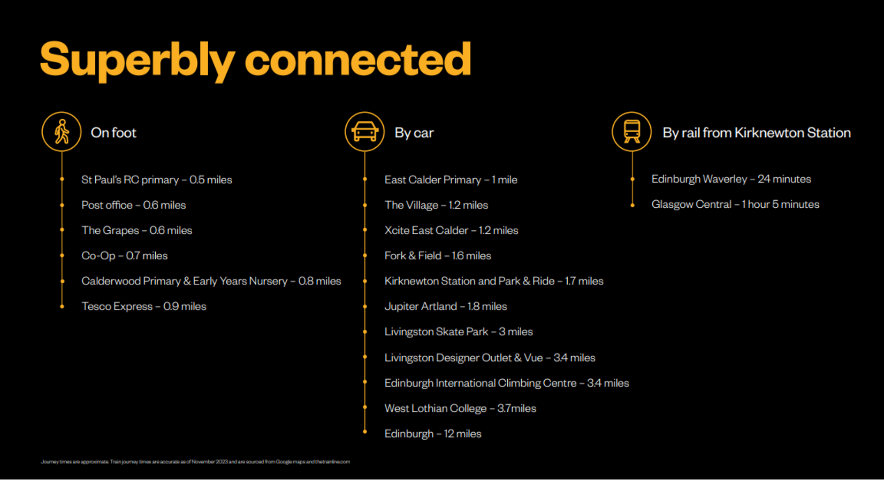 By rail: Kirknewton station, with park and ride facilities, offers fast regular services to Edinburgh, Glasgow and beyond.