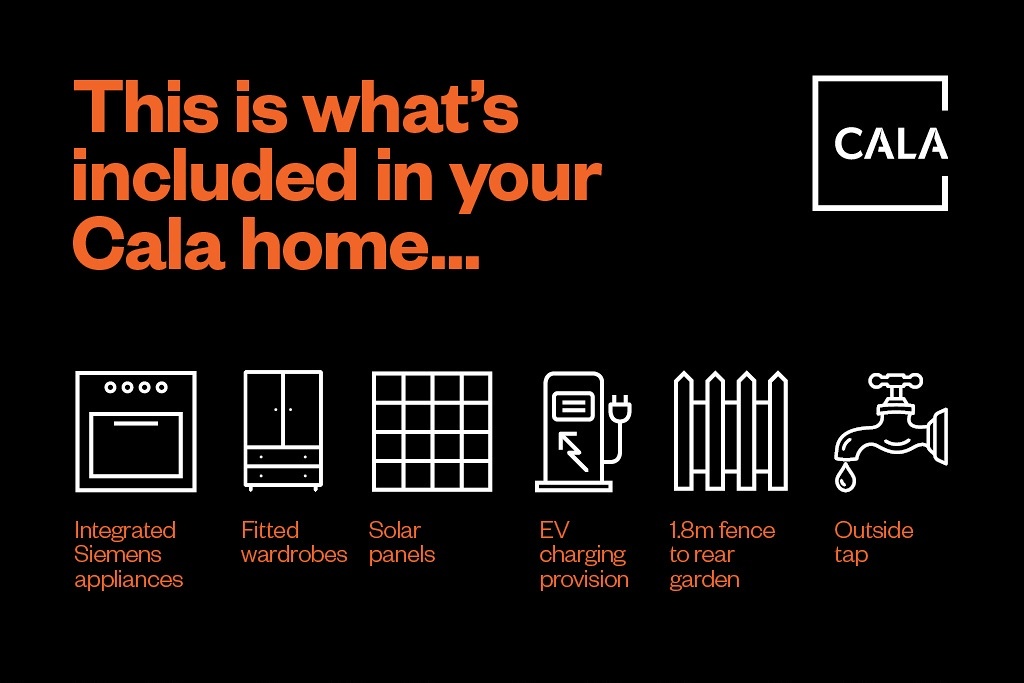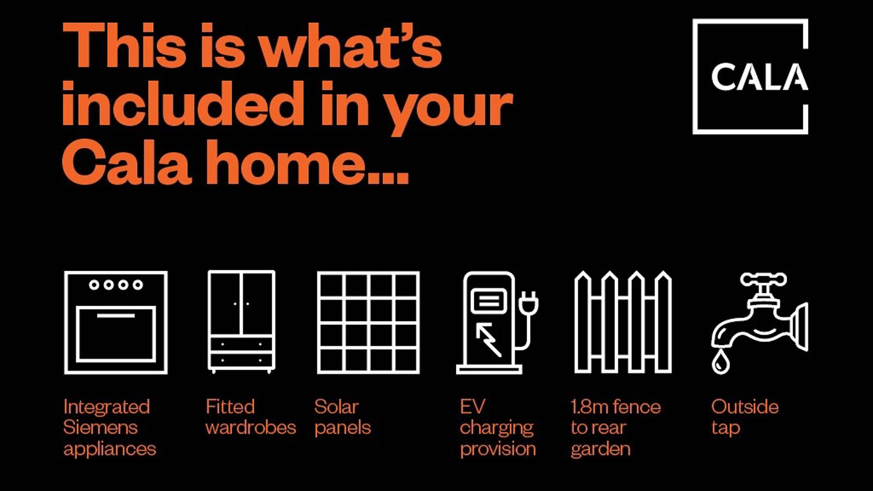 Photography may have been enhanced in post-production and may include upgrades at additional cost. Computer Generated Images may show features fittings, décor, flooring and soft furnishings which are not fitted as standard in a Cala home. CGIs are used to suggest possible finishes that can be achieved in your home at an additional cost. Please consult a Cala representative for further details.