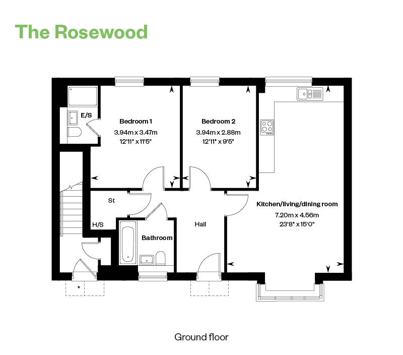 The 2 bedroom Rosewood maisonette is a stylish and flexible home, with an expansive kitchen/living/dining room with bay window that floods the room with natural light. Complete with integrated kitchen appliances.