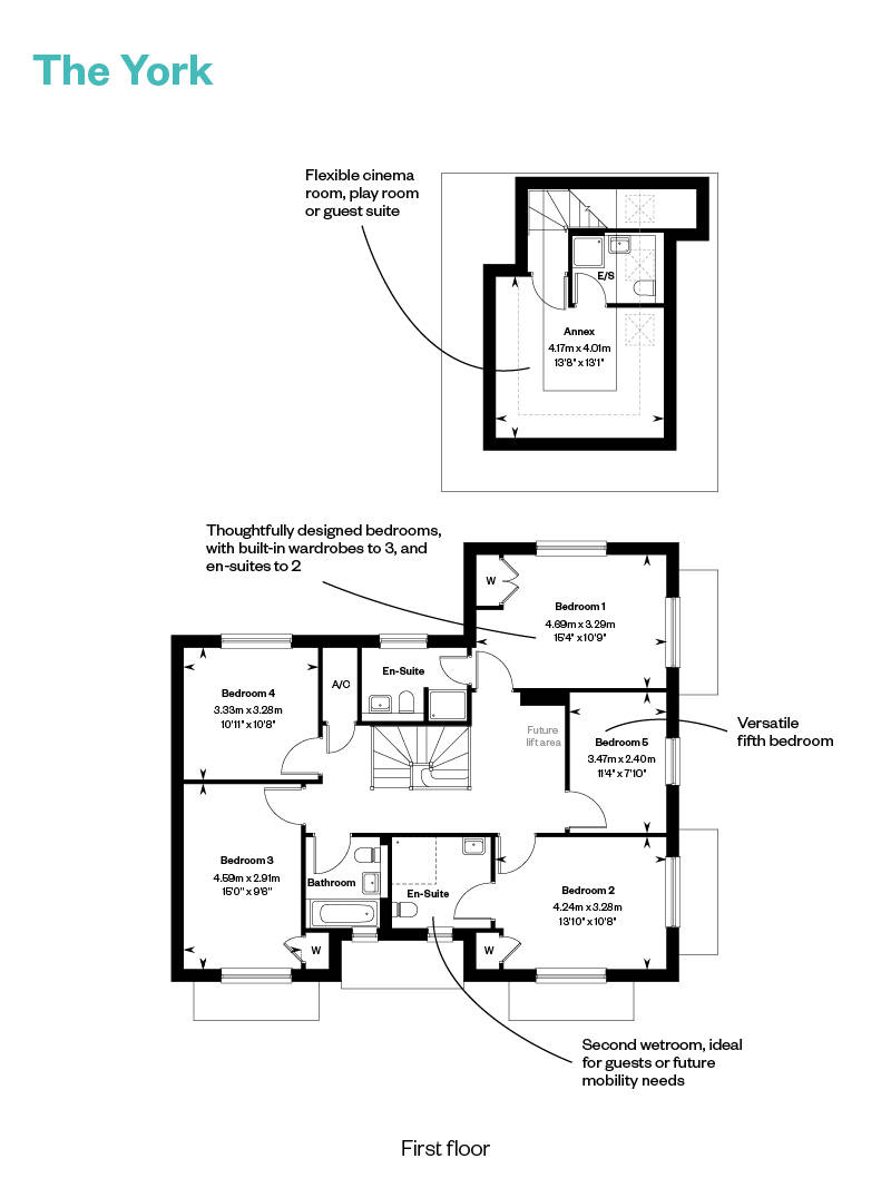 Designed with family living in mind, The York offers space, comfort, and adaptability. Step-free access, a ground floor wetroom, and wide doorways make everyday life easier. Enjoy flexible rooms including a dining area, study, and a bright sitting room with bi-fold doors to the garden.