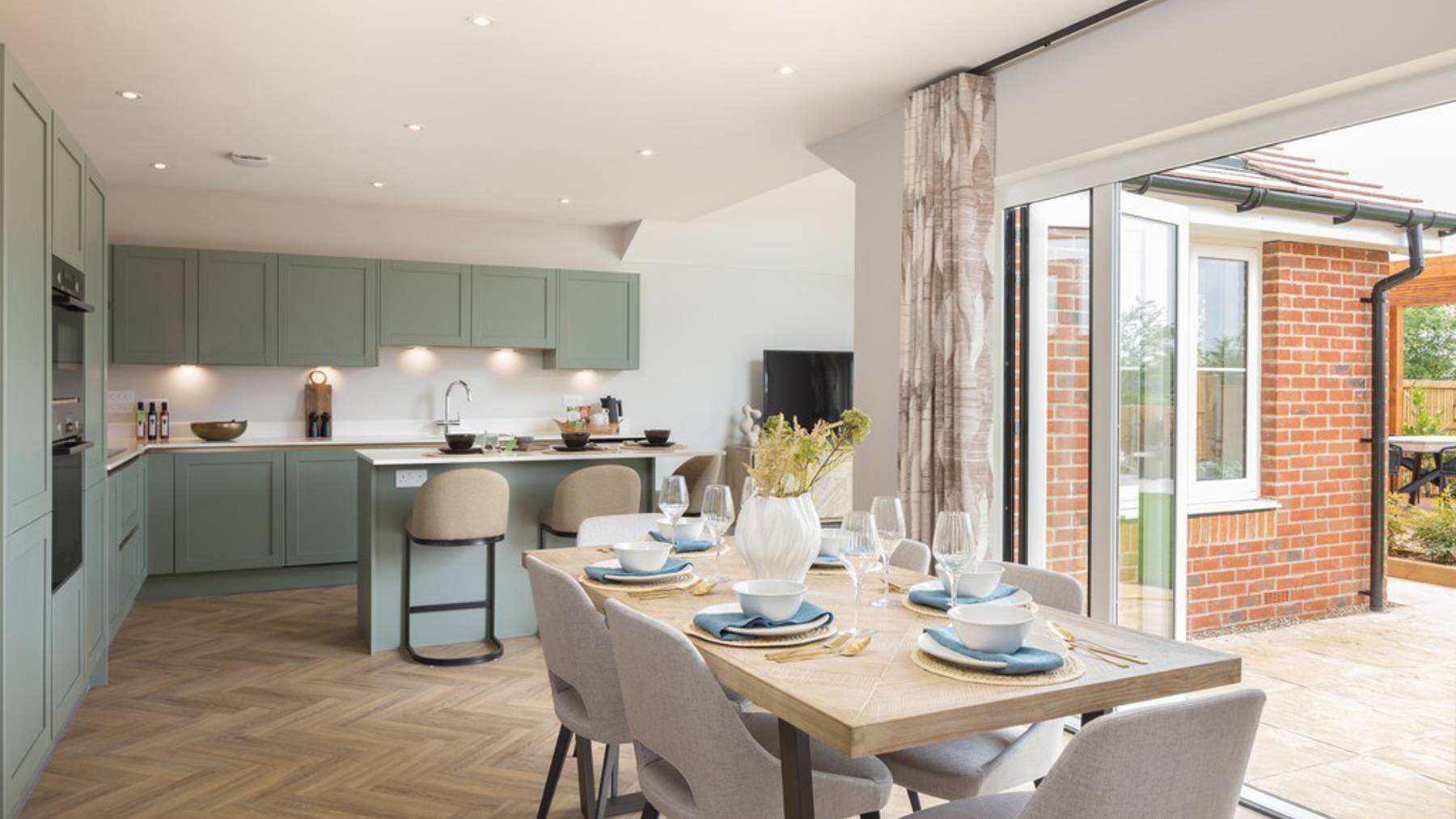 To the rear of the home is an expansive kitchen / dining / family room filled with natural light thanks to two sets of bi-fold doors which open into the garden. Thoughtfully designed living space with a kitchen island and family living, ideal for indoor-outdoor living. A seperate utility room sits just off the kitchen with a patio door leading into the garden.