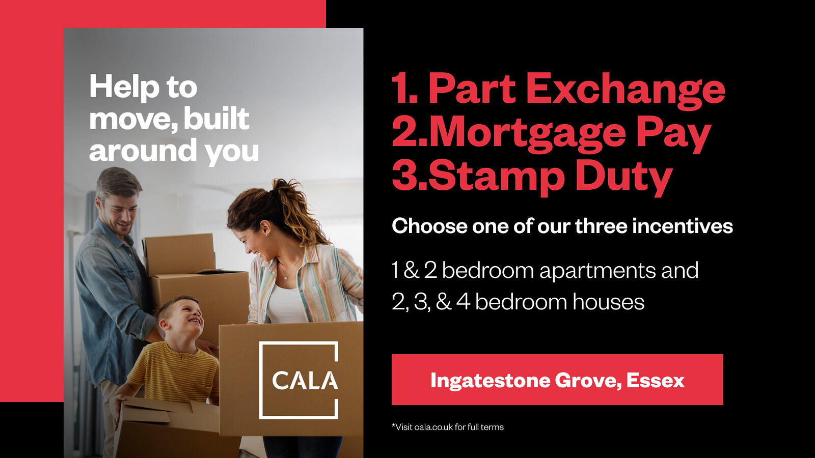 There are so many reasons to move into a quality specification new home at Ingatestone Grove. To help make it happen, we have three great moving solutions that you can select from: Part Exchange, Mortgage Pay or Stamp Duty contribution. Cala. Let’s talk.