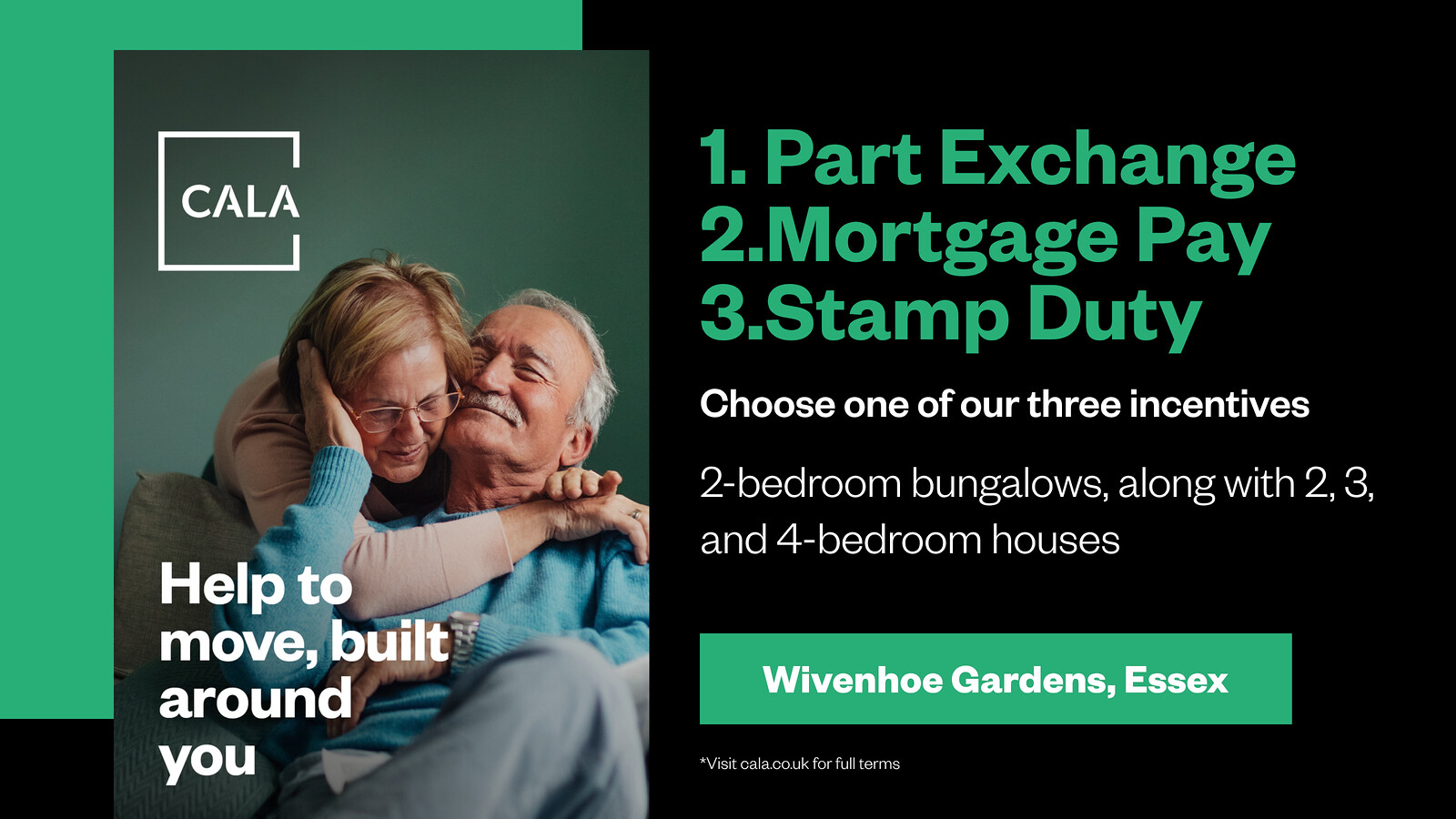 There are so many reasons to move into a quality specification new home at Wivenhoe Gardens. To help make it happen, we have three great moving solutions that you can select from: Part Exchange, Mortgage Pay or Stamp Duty contribution. Cala. Let’s talk.