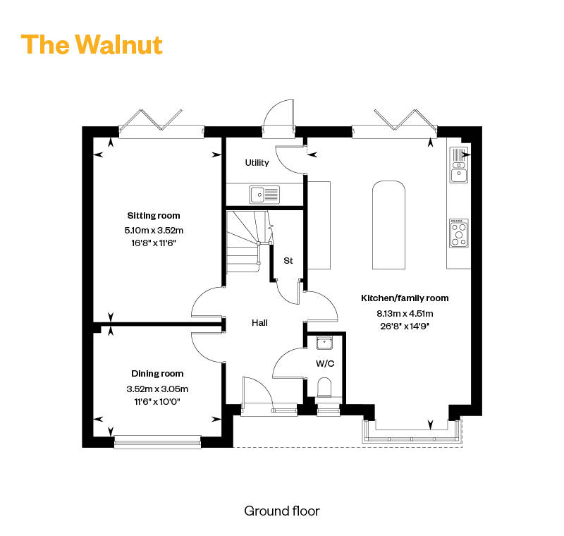The Walnut is a spacious four bedroom family home that combines generous living areas with thoughtful design. The ground floor features an impressive open plan kitchen, family and dining space ideal for modern living, complemented by a bright sitting room and a dedicated utility room for everyday convenience. A handy WC completes the layout.
