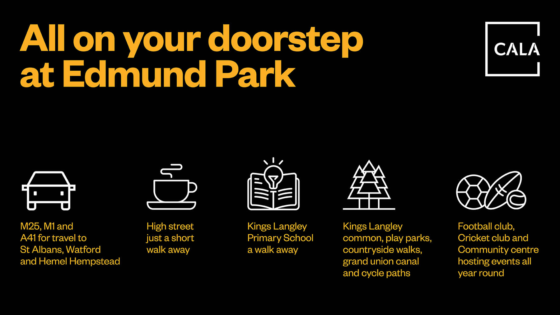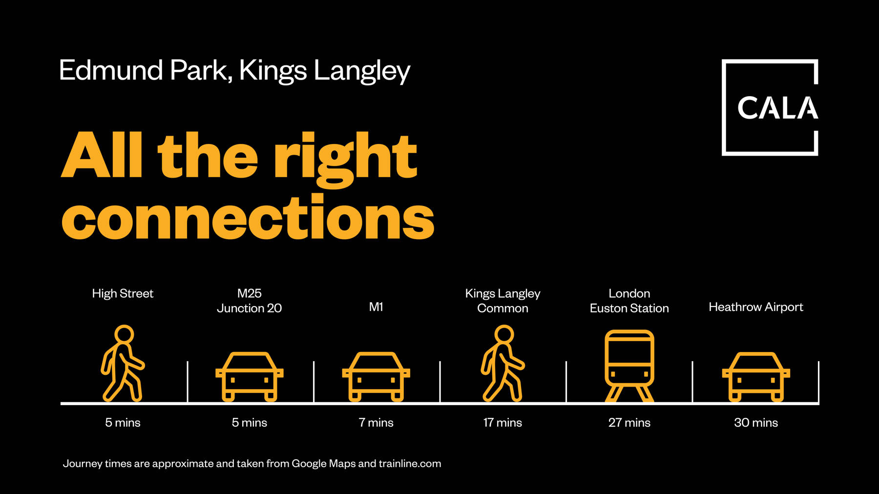 Just a 5 minute drive away you'll reach Kings Langley train station, with direct links to: London Euston (27 minutes) Watford Junction (4 minutes) Hemel Hempstead (6 minutes) Edmund Park is well located for journeys to neighbouring towns such as Watford & Hemel Hempstead. Reach London Luton airport in 25 minutes via the M25.