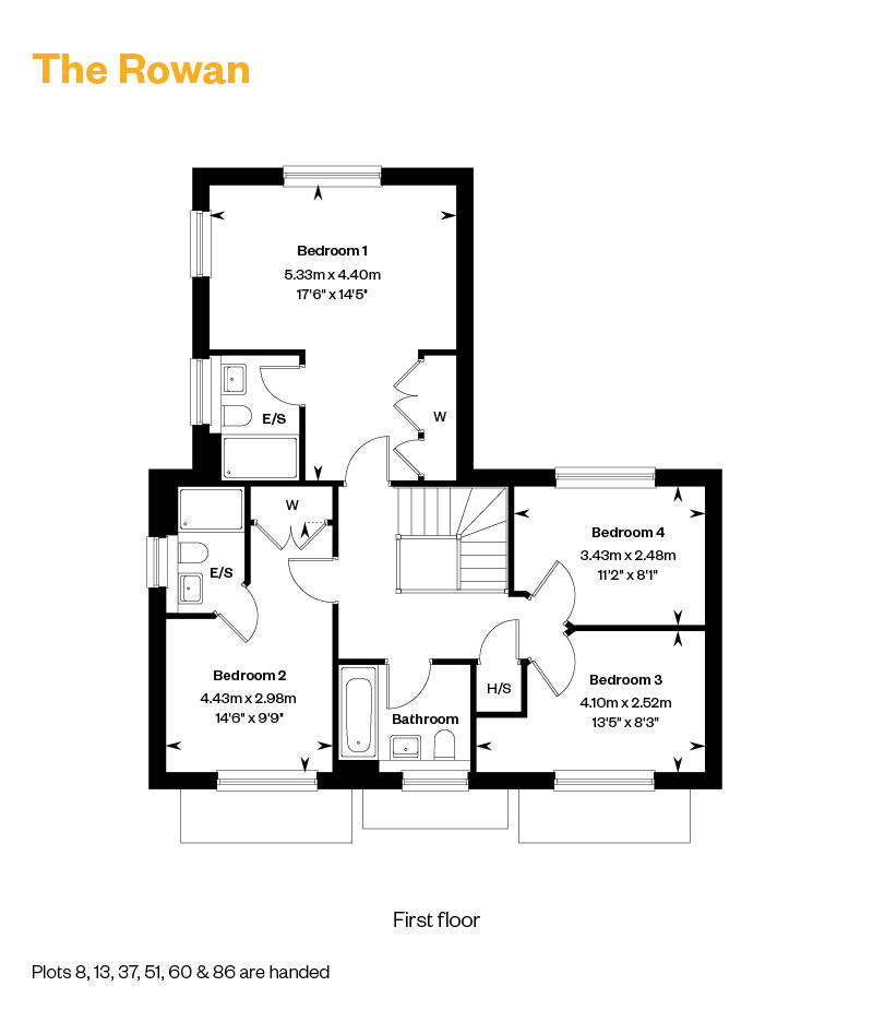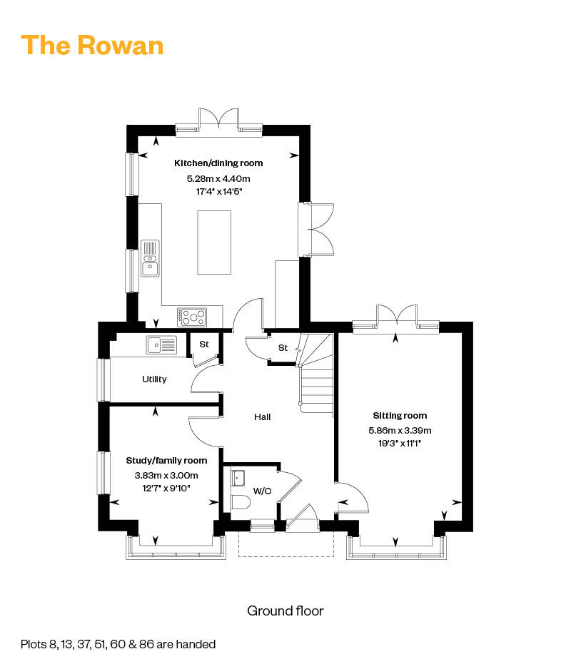 Characterised by its light and space, The Rowan is a family home to be reckoned with. Downstairs, the triple aspect, front-facing sitting room - complete with French doors to the garden - and dual aspect study, both have bay windows, letting in plenty of natural light. At the heart of the home sits a generous kitchen/dining room, complete with sleek Silestone worktops, a Bosch full height fridge and freezer, and two sets of French doors that flood the room with natural light. A practical utility room adds everyday convenience.