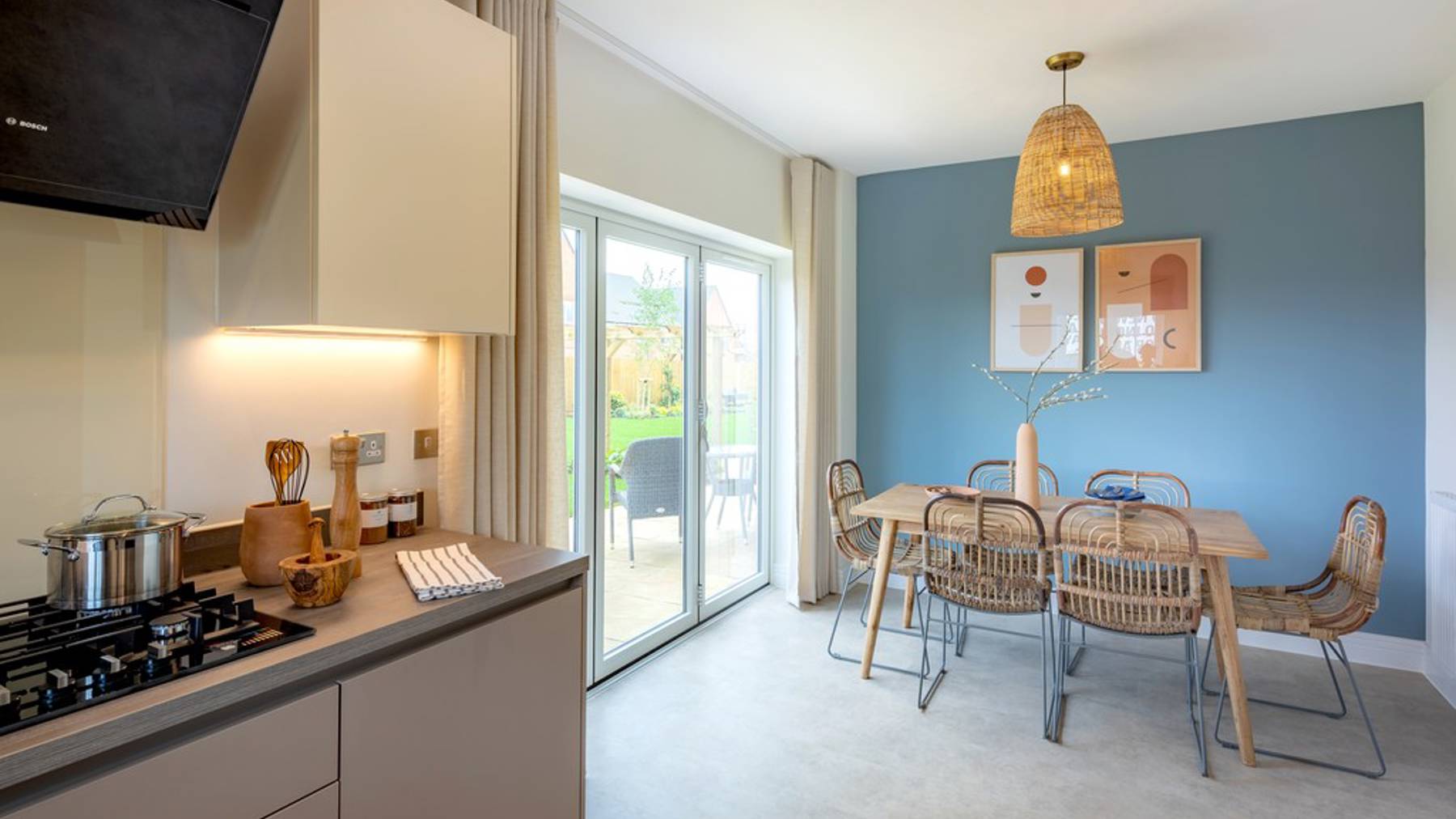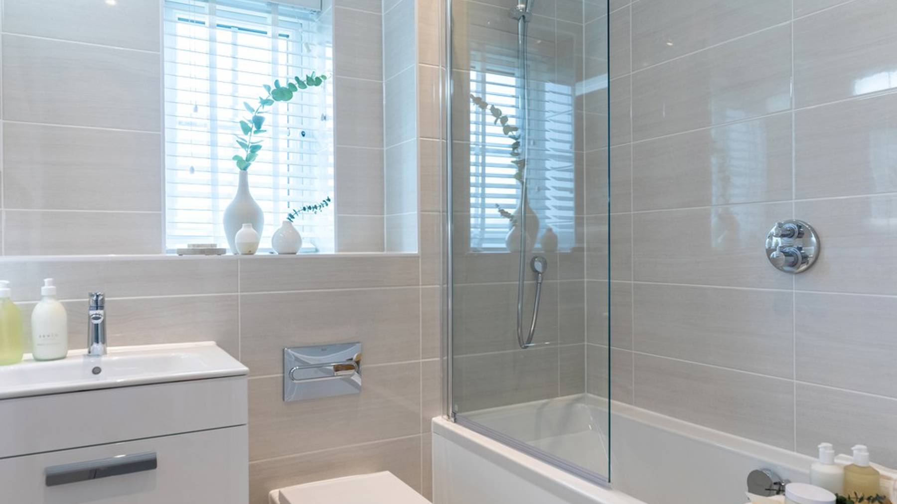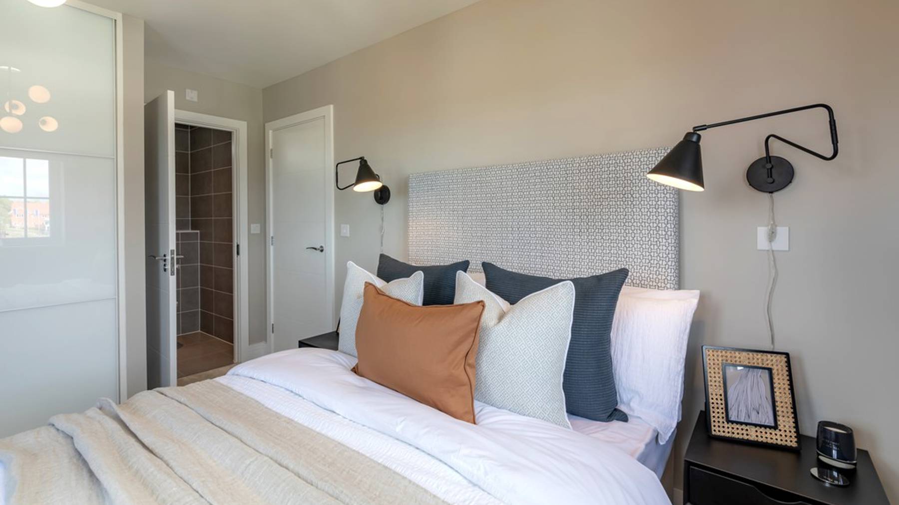 The kitchen is fitted with integrated Bosch appliances while bathrooms and the downstairs cloakroom feature full-height Minoli tiles and Roca sanitary ware. The double-aspect main bedroom features an en-suite bathroom and built-in wardrobe to create a clean, secluded private space.