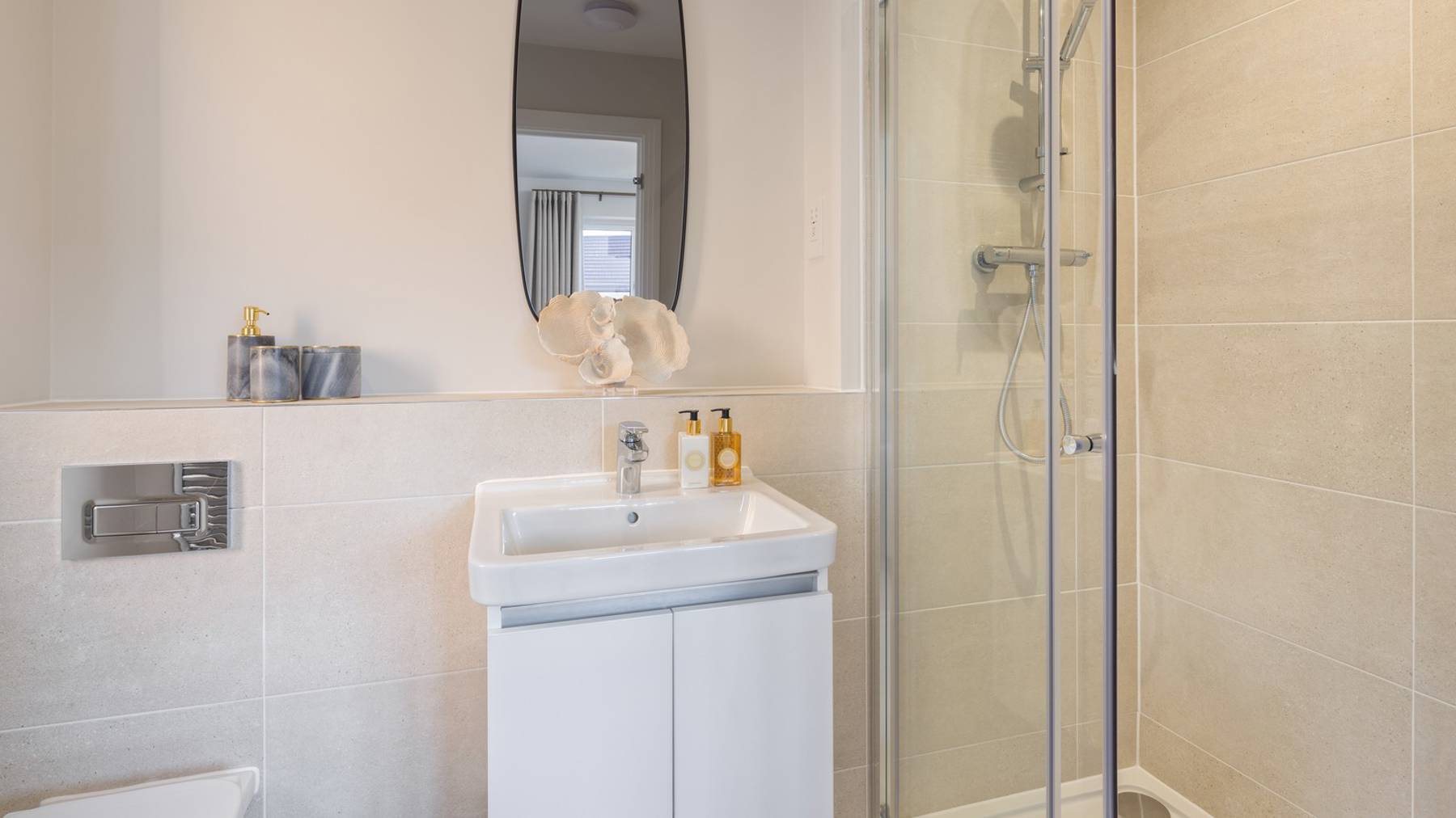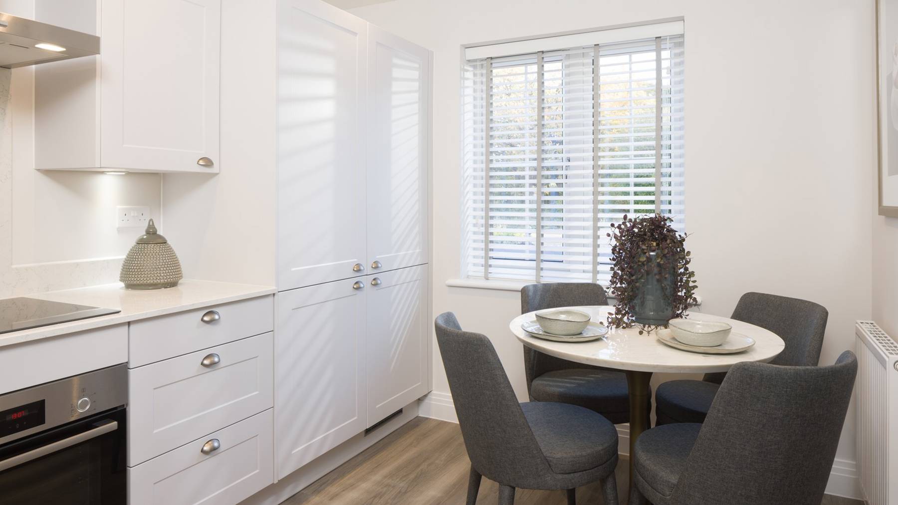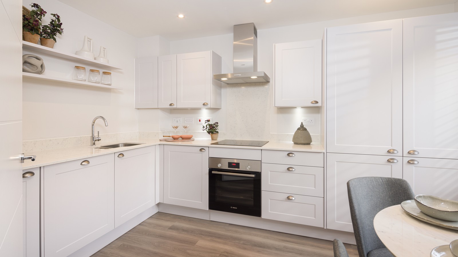 Smart design creates a sense of light and space on the ground floor. The hallway opens onto a full-width sitting which leads out to the turfed rear garden through French doors, perfect for socialising, relaxation and play. There’s a fitted kitchen, featuring high quality appliances and finishes. The perfect space for your dining room too.
