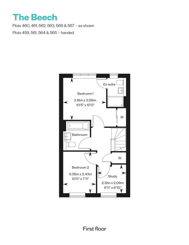 The first floor is home to two bedrooms, a study and a family bathroom. Bedroom 1 has its own en-suite bathroom and built in wardrobe.