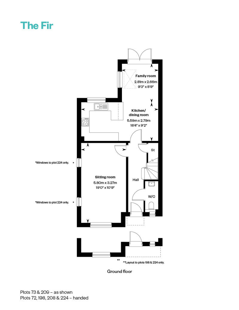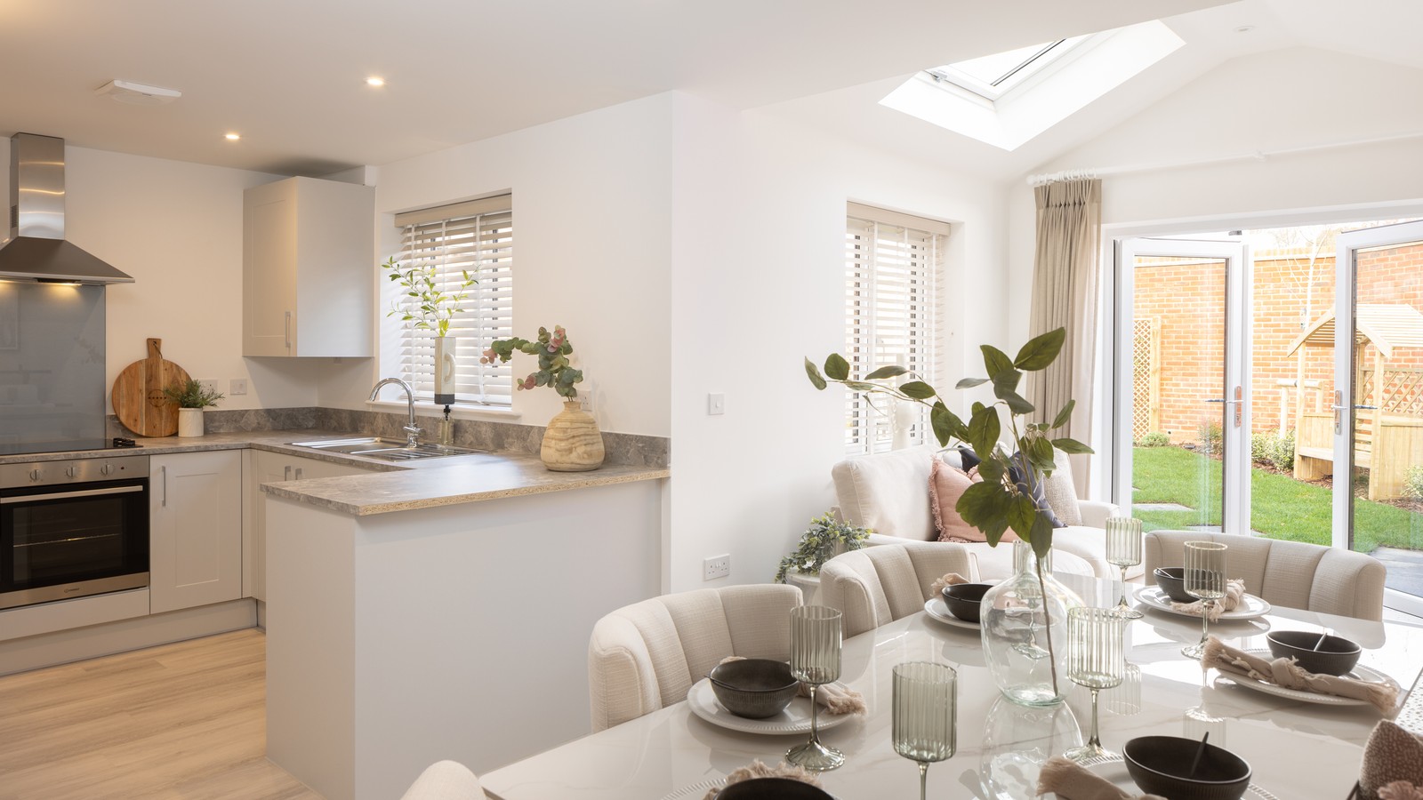 The 3 bedroom Fir features an extra-large window at the front of the fully carpeted sitting room, on the left-hand side of the hall as you enter this very contemporary home and bringing in plentiful natural light. The expansive, dual aspect family/kitchen/dining room at the end, meanwhile, features integrated Indesit appliances, including an oven, dishwasher and fridge freezer, and opens out to the lawned garden through a set of French doors.