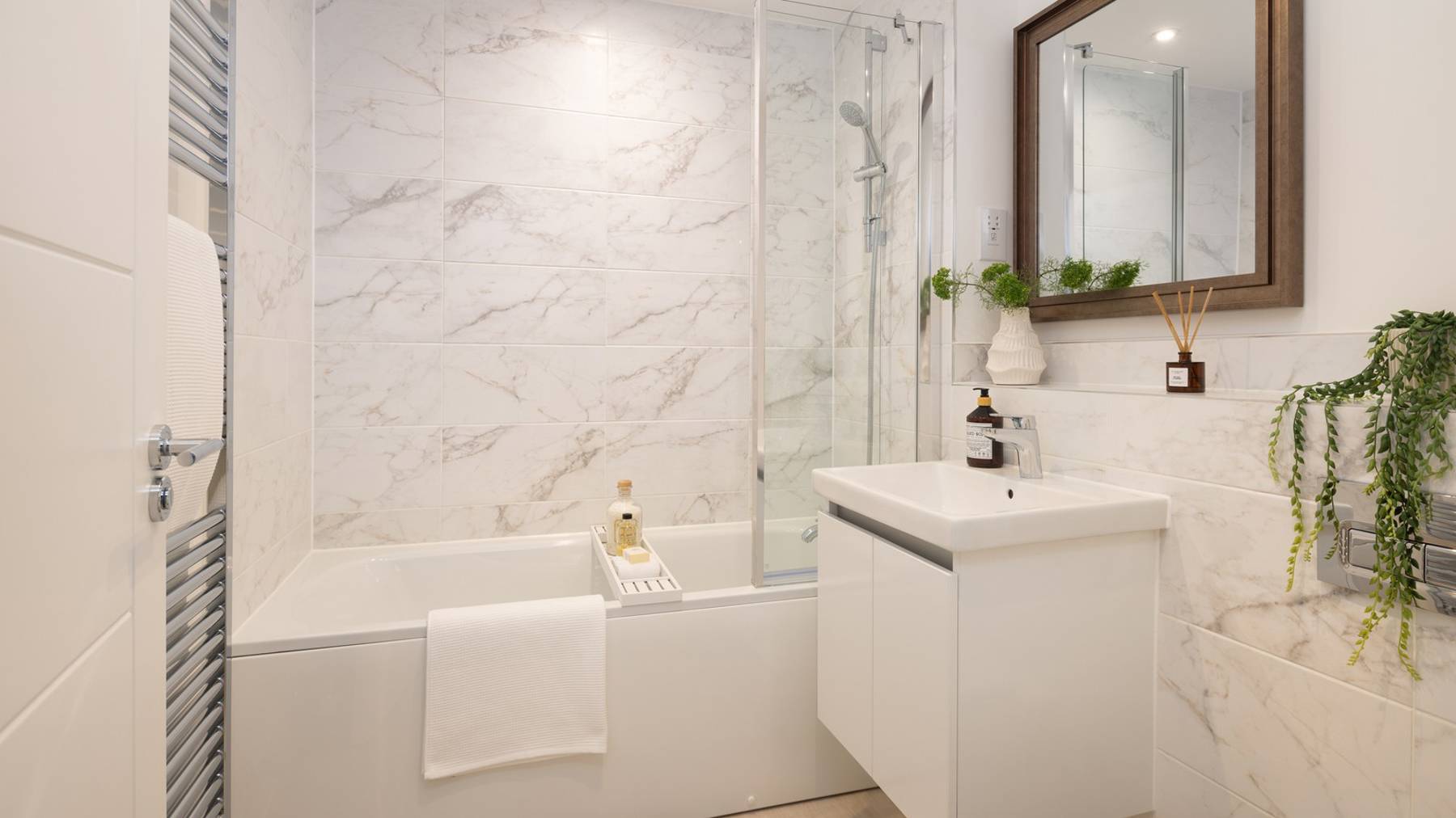 Upstairs, the spacious, front-facing Bedroom 1 enjoys the comfort and practicality of a fitted wardrobe and an en-suite complete with Porcelanosa tiling to the walls. A separate family bathroom, with White Roca sanitaryware, serves Bedrooms 2 and 3. The home also includes an EV charging point and PV panels as standard.