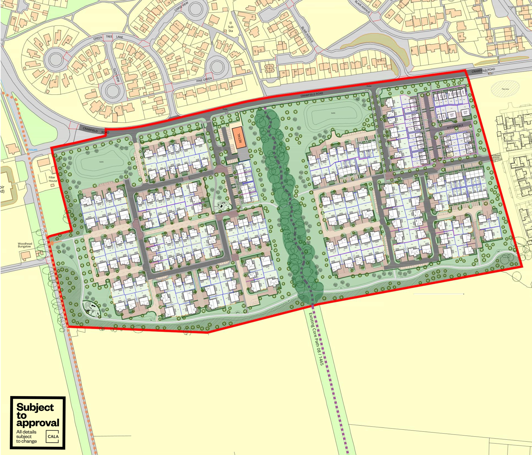 The development will deliver 188 private Cala homes, comprising a mix of 3 bedroom terraced and 4 and 5 bedroom detached properties, alongside 33 affordable homes. Almost a third of the site will be given to green spaces and landscaping, including a woodland area which divides the site. Various connecting active travel routes will be featured through the woodland area and around the development.