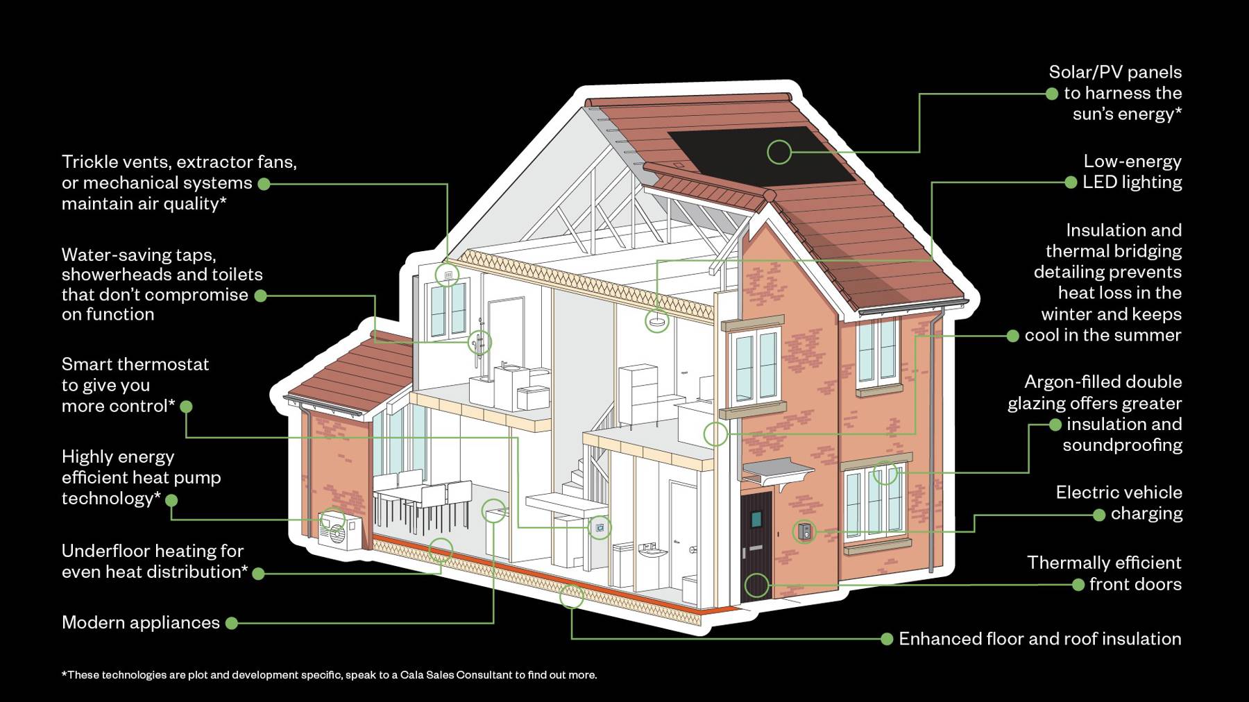 Our homes incorporate the latest sustainable technologies  where possible, such as solar (PV) panels and air source heat pumps, to maximise energy efficiency. Every Cala home comes with an electric vehicle charging point (or provision), ensuring our customers are equipped for a greener, electric future.